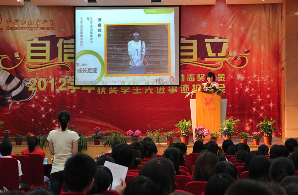 校党委副书记林长兴在为“2011年度资助工作先进个人” 获得者——邵霞琳、施晶晶颁奖后作了讲话。他说,家庭由不得我们选择,未来的路却在我们脚下,命运是可以通过我们自己的不懈努力来改变的。他勉励大家,只要有梦想、有追求,学校便是大家坚强的后盾。他希望同学们在遇到困难时不畏不惧,把困难和逆境转化为发展的动力;充分利用大学生活的每一天,刻苦学习、奋力拼搏,把握自己未来命运,迎接更加精彩、灿烂的明天!