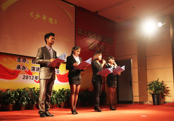 “翻过七十七张历史厚重的扉页/应该记得/那段带有刺骨朔风的峥嵘岁月/ 沿着风雨飘摇的红色轨迹 /一种金戈铁马般的呐喊……”昨日,信息大楼报告厅内不时传出或激昂的或深情或抑扬顿挫的朗诵声,这是校团委、校社团联合会为纪念一·二九运动77周年而主办的一场诗歌朗诵比赛,也是校第十届社团文化节系列活动的压轴大戏。
