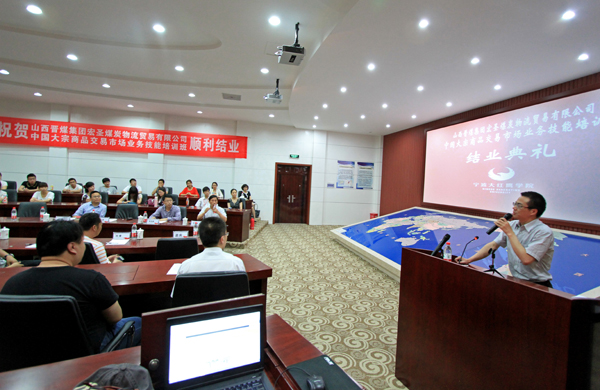 5月27日下午,我校首届中国大宗商品交易市场业务技能培训班结业典礼在大宗商品地理信息中心举行。中物联大宗商品交易市场流通分会副会长周旭,山西晋煤集团宏圣煤炭物流贸易有限公司党总支副书记王君会、副总经理何鹰,我校校长助理沈云慈及相关部门负责人出席典礼。典礼由经管学院副院长李书进主持。