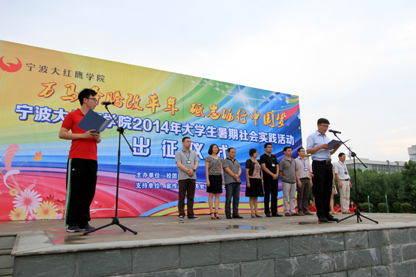 仪式上,教务处副处长陶若平宣读了2014年校级重点暑期社会实践团队名单,包括“爱行四方”、“爱行甬城,筑梦青春”、“一米阳光”等共22支暑期社会实践团队。