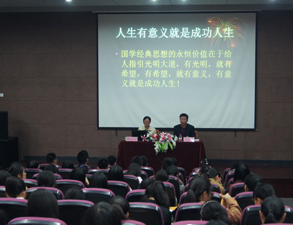 讲座中,陶志琼教授引经据典,运用大量鲜活生动的事例和唯美诗意的语言,对《论语》、《道德经》、《大学》、《弟子规》等国学精粹进行了通俗易懂的诠释,使同学们进一步加深了对国学精华思想的理解,也极大地调动了现场的气氛和听众的积极性。陶教授说,国学经典思想的永恒价值在于给人指引光明之道,有光明就有希望,有希望就有意义,有意义就是成功人生。她希望,同学们在日常生活中要多积口德,修宽恕之心,勤行圣人之道,方才获得幸福成功的人生。