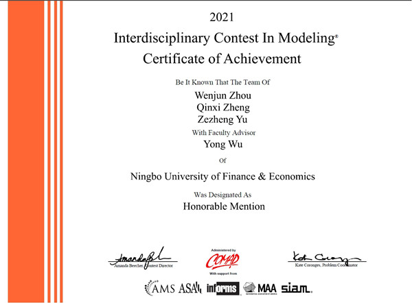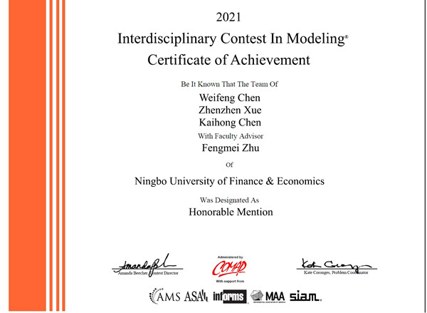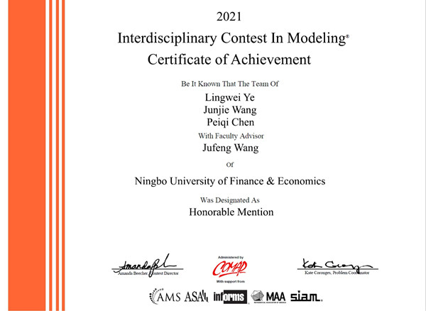 日前,从美国(国际)大学生数学建模竞赛组委会传来喜讯,由我校吴用、魏麒、王聚丰、朱凤梅等老师指导,蔡溶瑾、傅郑一、郑佩艳团队,郑钦喜、俞泽峥、周文俊团队,陈炜峰、薛桢桢、陈锎红团队以及陈沛琦、王俊杰、叶灵微团队均获得2021年美国(国际)大学生数学建模竞赛(MCM/ICM)国际二等奖。这也是我校学子在该项赛事上连续第三次获奖。