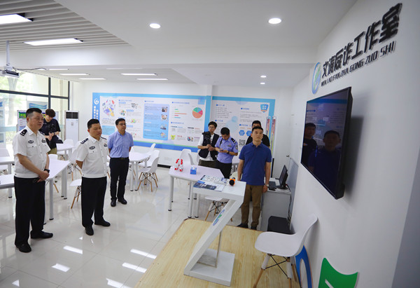 项敏一行实地参观了“文涛反诈工作室”,该工作室是宁波市首家校园反诈工作室,由海曙公安分局高桥派出所与我校于2019年联合成立,旨在密切警校联动,大力推进学校和周边社区反诈宣传教育,全面降低各类诈骗发案率。高桥派出所潘文涛警官简要介绍了工作室建设和相关反诈工作开展情况;我校保卫处负责人主要汇报了学校在防范电信网络诈骗的相关经验和做法。