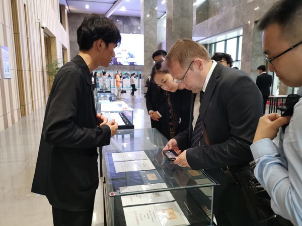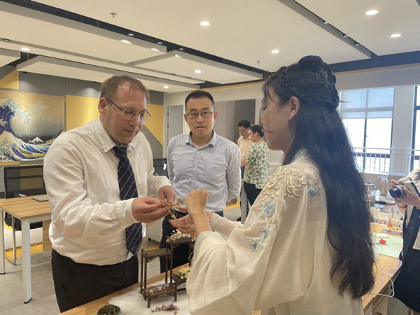 Balogh András Zoltán(鲍洛安)一行首先参观了由“泉遇文创”承办的“峥嵘百年,与党同行——浙东红色金融货币展”。随后,来宾一行参观了我校商业模式实验室(杭州湾)孵化园,该孵化园集聚了学校众多创业项目与初创团队,Balogh András Zoltán(鲍洛安)对“予初手作”工作室的汉服配饰尤为感兴趣。“泉遇文创”“予初手作”均为我校长城商学院创业管理专业2019级学生的创业项目。