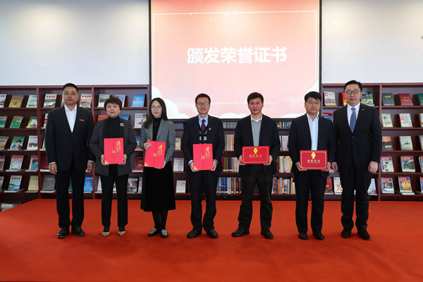 毛俊嵘、许锁迪为图书馆捐赠书籍的机构与个人代表颁发荣誉证书